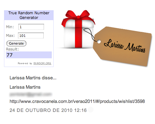 Antes de mais nada, quero muito agradecer à participação de todos! Me surpreendi muito com o número de inscrições, afinal para o sorteio acontecer, eram necessárias 10 participações e no total foram 101! Muito obrigada mesmo!!!