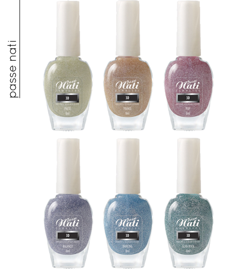 A Passe Nati, também lançou sua linha 3D, inspirada em ritmos musicais. São seis cores diferentes, mas não tive a oportunidade de experimentar nenhum. Pelas fotos, devem ser parecidos com os esmaltes Eliana Super Pérola ou com os da Top Beauty. É uma marca mais em conta, um pouco menos conhecida e não tão fácil de encontrar, mas diz a lenda que a qualidade dos produtos é boa.