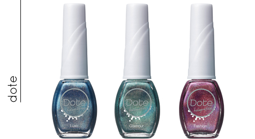 A Dote lançou durante a Beauty Fair sua coleção de esmaltes intitulada Trio Elétrico. Talvez esta seja uma das opções mais próximas que temos de um “holográfico” de verdade. Eu ainda não experimentei, mas pelas fotos eles devem ser parecidos com os esmaltes da Sancion Angel, inclusive no preço: a média é de R$8,00 por unidade.
